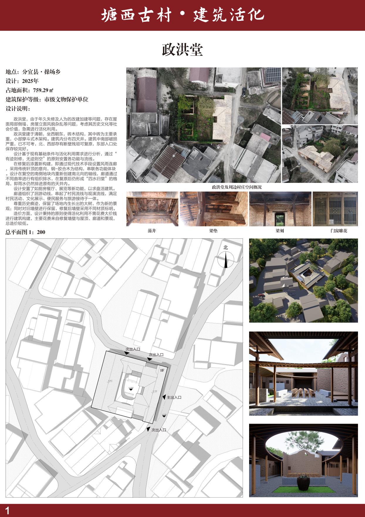 在设计过程中,团队紧扣以专业力量赋能古村保护的大赛核心宗旨,深耕传统村落保护与活化设计,既注重守护塘西村传统建筑的原有肌理与历史风貌,尤其针对市级文物保护单位政洪堂年久失修、风貌杂乱等问题,制定针对性修复与活化方案;又充分兼顾农户生产生活实际需要,让设计方案兼具文化传承性与现实实用性,实现了传统村落保护与乡村发展的有机融合。