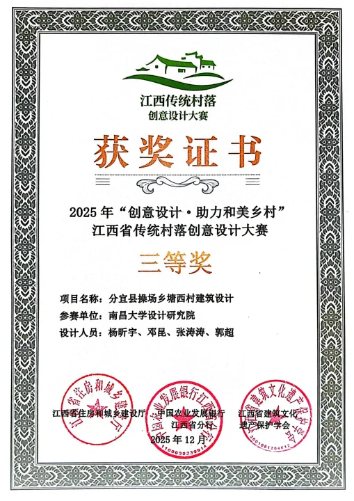 近日,创意设计·助力和美乡村江西省传统村落创意大赛的颁奖典礼在南昌圆满举行,由范丽娅周志仪、马凯指导,杨昕宇、邓昆、张涛涛、郭超等设计,南昌大学设计研究院与建筑与设计学院师生联合打造的《分宜县操场乡塘西村建筑设计》项目脱颖而出,喜获大赛三等奖!